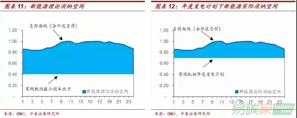 原因三:年度發(fā)電計(jì)劃相當(dāng)于增加常規(guī)機(jī)組最小技術(shù)出力,壓縮新能源消納空間。中國(guó)電力系統(tǒng)在某種程度依然執(zhí)行發(fā)電計(jì)劃,省級(jí)計(jì)劃?rùn)C(jī)構(gòu)(通常是省級(jí)經(jīng)信委)負(fù)責(zé)制定年度發(fā)電計(jì)劃,即決定各類發(fā)電機(jī)組運(yùn)行小時(shí)數(shù),計(jì)劃匯總的年度和每月的發(fā)電量包含在發(fā)電機(jī)組的年度合同中。由于年度計(jì)劃的執(zhí)行,相當(dāng)于提升了常規(guī)機(jī)組的最小出力,壓縮了新能源消納空間。