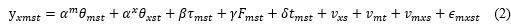 碳市場建立之后的虛擬變量或碳市場所帶來的排放成本;τst 為歐盟對S 部門實施的平均關稅率;Vt 為年份固定效應;Vxs 為進口國固定效應;Fst 包括S 部門的熟練工人、非熟練工人和資本的邊際報酬;εxst 為隨機誤差項。
