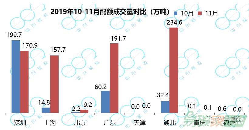 截至2019年11月30日,配額累計(jì)成交量3.7億噸,成交額79.9億元。廣東、湖北成交量最高,位于第一梯隊(duì);深圳、上海、北京位于第二梯隊(duì);而天津、重慶、福建的成交量相對較低,位于第三梯隊(duì)。