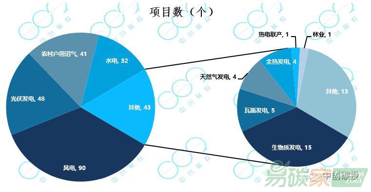 從項(xiàng)目類別看,已獲得減排量備案且材料公示的254個項(xiàng)目中,有第一類項(xiàng)目139個,合計(jì)備案減排量1890萬噸CO2e;第二類項(xiàng)目17個,備案減排量372萬噸CO2e;第三類項(xiàng)目98個,備案減排量3031萬噸CO2e。從項(xiàng)目類型看,風(fēng)電、光伏、農(nóng)村戶用沼氣、水電等項(xiàng)目較多,詳細(xì)情況如下圖所示: