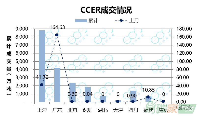 四川、福建CCER市場有成交,累計(jì)成交量218.4萬噸,較10月(100.3萬噸)大幅上升54.1%;廣東、上海CCER市場較為活躍,分別成交164.63萬噸、41.70萬噸。