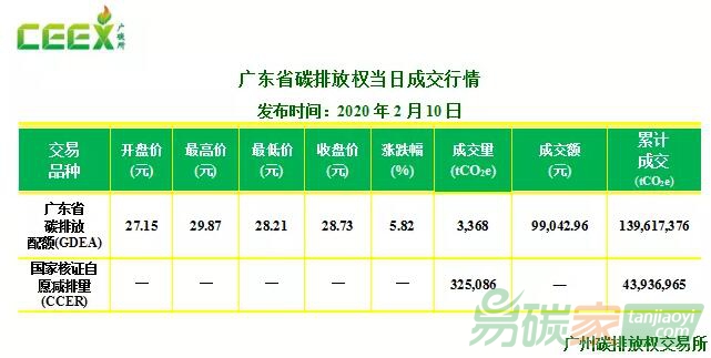 2月10日,廣東碳市場成交配額3,368噸,成交金額99,042.96元,開盤價(jià)27.15元/噸,收盤價(jià)28.73元/噸,較前一交易日上漲5.82%。ccer協(xié)議轉(zhuǎn)讓成交325,086噸。