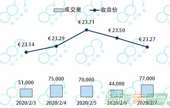 2020年02月03日至2020年02月07日,歐盟碳價(jià)在23.14-23.71歐元每噸之間波動(dòng)。