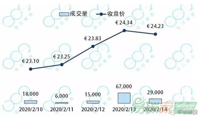 2020年02月10日至2020年02月14日,歐盟碳價(jià)自23.10歐元回升至24.23歐元美元每噸,上漲4.9%。