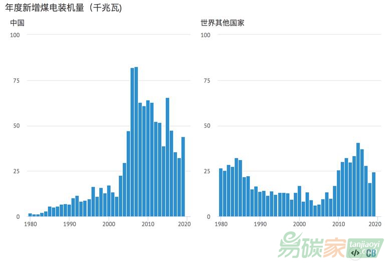 1980年至2019年間,中國(左圖)和世界其他地區(qū)(右圖)每年新增的煤電裝機量(千兆瓦)。