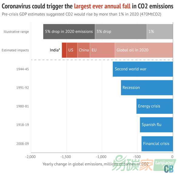碳排放量可能下降4%。該研究機(jī)構(gòu)副主編西蒙埃文斯(Simon Evans)稱,這將比以往任何一次經(jīng)濟(jì)危機(jī)或戰(zhàn)爭(zhēng)所造成的年度降幅都要大。