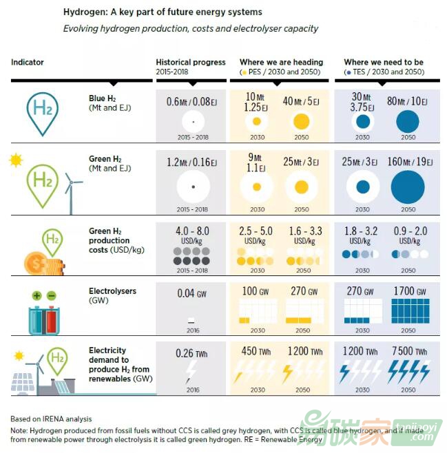 2018年綠氫成本約4-8美元/公斤,按照目前的趨勢到2030年可達(dá)2.50-5.0美元/公斤、2050年可達(dá)1.6-3.3美元/公斤;但是按照巴黎氣候協(xié)定的要求2030年應(yīng)達(dá)1.8-3.2美元/公斤、2050年應(yīng)達(dá)0.9-2.0美元/公斤。