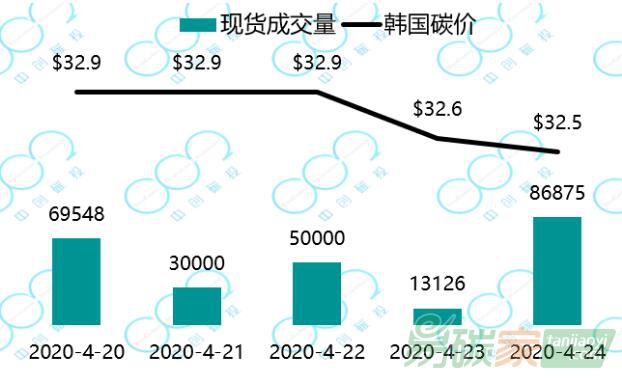 2020年4月20日至2020年4月24日,韓國(guó)碳價(jià)小幅下跌至32.5美元每噸。受疫情影響,韓國(guó)碳市場(chǎng)主管部門將履約期限延長(zhǎng)了一個(gè)月至2020年7月31日。