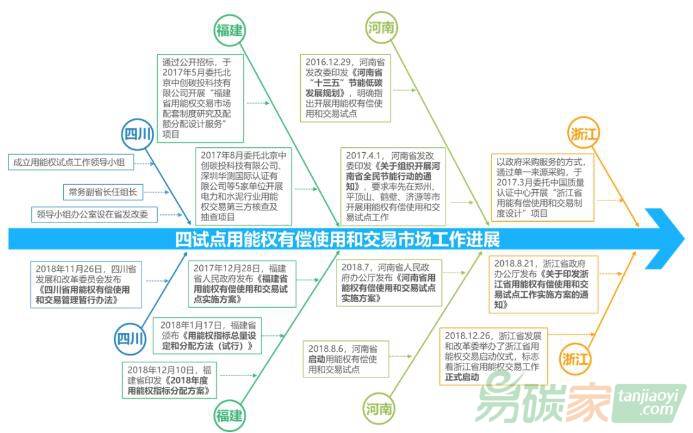 四川省開展用能權(quán)有償使用和交易試點(diǎn),并逐步完善方案,2019年試點(diǎn)任務(wù)取得階段性成果,形成可復(fù)制可推廣的經(jīng)驗(yàn),將在2020年開展試點(diǎn)效果評(píng)估,視情況逐步推廣。方案公布后,四試點(diǎn)響應(yīng)國家號(hào)召,均對(duì)用能權(quán)交易做了相應(yīng)嘗試,但由于各試點(diǎn)起步時(shí)間、社會(huì)基礎(chǔ)等不同,各省工作進(jìn)展不同,其中浙江省的推進(jìn)力度最大。2018年年底之前各試點(diǎn)的推進(jìn)情況如下圖所示。2018年當(dāng)年四試點(diǎn)推進(jìn)工作,國家層面沒有新的重大政策出臺(tái)。