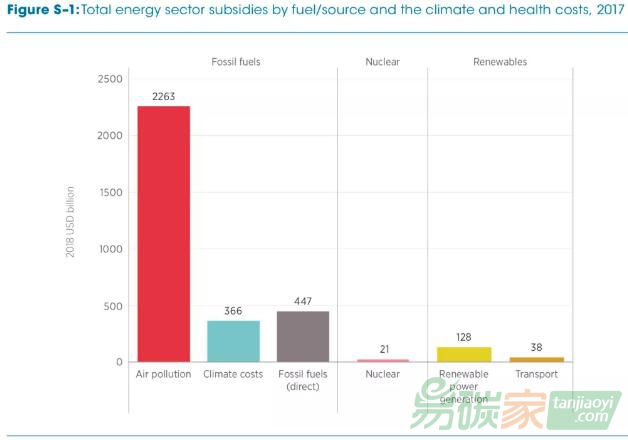 國(guó)際可再生能源署(IRENA)發(fā)布報(bào)告,估計(jì)2017年全球各國(guó)為能源部門(mén)提供的直接補(bǔ)貼至少為6340億美元。其中,4470億美元補(bǔ)貼給化石燃料(占比70%),1280億美元給可再生能源發(fā)電,380億美元給可再生能源生物燃料(可再生能源補(bǔ)貼占比26%)。各國(guó)對(duì)于核能的補(bǔ)貼缺乏數(shù)據(jù),但匡算為210億美元。如果考慮到化石燃料的外部性成本,全球?qū)τ谀茉床块T(mén)的補(bǔ)貼將大幅上升至3.1萬(wàn)億美元,其中化石燃料的空氣污染成本高達(dá)2.3萬(wàn)億美元、氣候變化成本3660億美元。