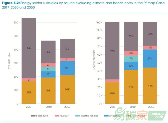 補(bǔ)貼下降的原因主要是各國(guó)對(duì)化石燃料直接補(bǔ)貼大幅度減少,將從2017年的4470億美元下降到2030年的1650億美元,2050年下降到的1390億美元。預(yù)計(jì)到2050年90%以上的化石燃料補(bǔ)貼僅用于支持工業(yè)應(yīng)用中的二氧化碳捕獲和儲(chǔ)存。隨著可再生能源發(fā)電的競(jìng)爭(zhēng)日益激烈,特別是對(duì)太陽(yáng)能光伏發(fā)電的早期高成本補(bǔ)貼到期,2030年可再生能源發(fā)電補(bǔ)貼降至530億美元,到2050年基本取消,屆時(shí)對(duì)可再生能源的補(bǔ)貼主要是可再生能源在其他領(lǐng)域的應(yīng)用。