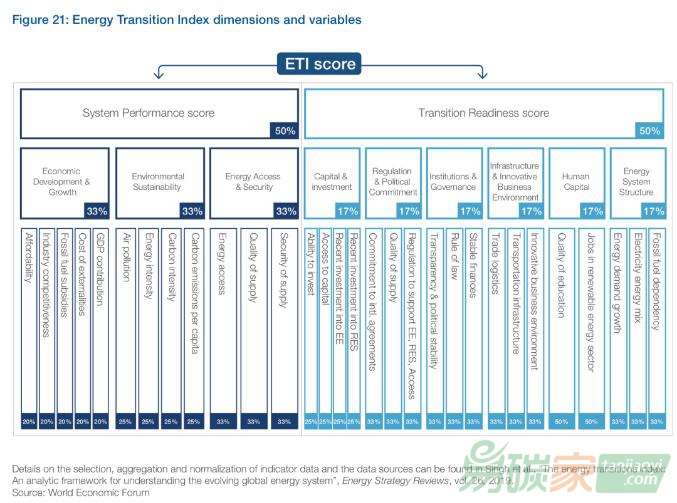 論壇發(fā)布2020年全球能源轉(zhuǎn)型報告,以“能源轉(zhuǎn)型指數(shù)(ETI)”評估各國能源系統(tǒng)轉(zhuǎn)型的進展。ETI指數(shù)框架由兩部分組成:1)目前能源系統(tǒng)的績效;2)推動能源轉(zhuǎn)型的有利環(huán)境評估。