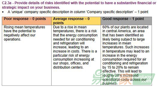 根據(jù)CDP評分方法,針對公司特殊性具體的回復(fù)比一般性陳述回復(fù)可獲得更高的分?jǐn)?shù)(如下圖)。