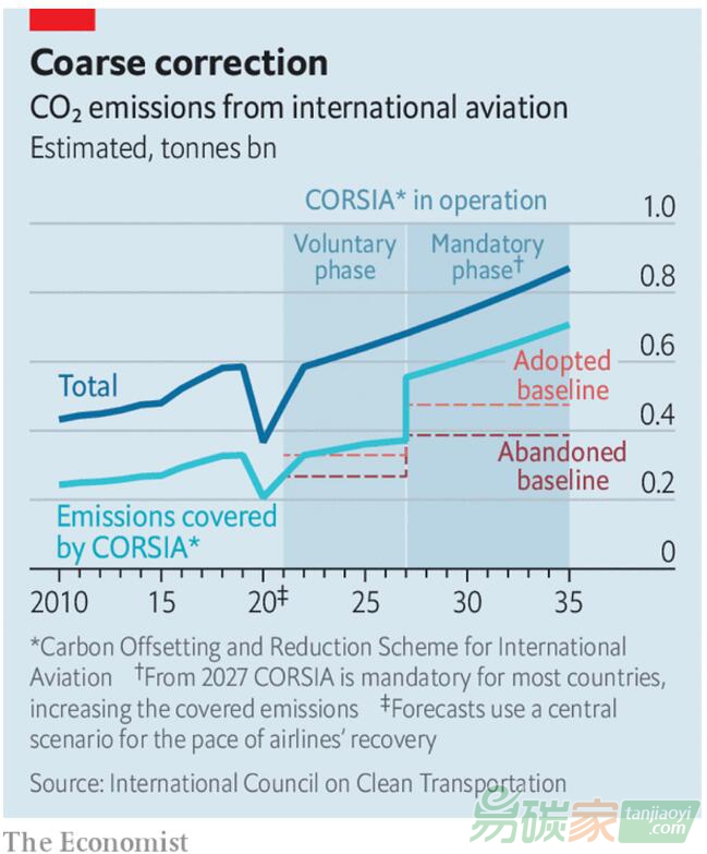 碳排放,2013年歐盟試圖將國際航空納入其排放交易計劃,航空業(yè)界強烈反彈。作為一個折衷方案,聯(lián)合國下屬的國際民用航空組織(ICAO)設(shè)計了國際航空碳抵消和減少計劃(Carbon Offsetting and Reduction Scheme for International Aviation,CORSIA),要求航空公司補償國際航班產(chǎn)生的超出基準線的二氧化碳排放。