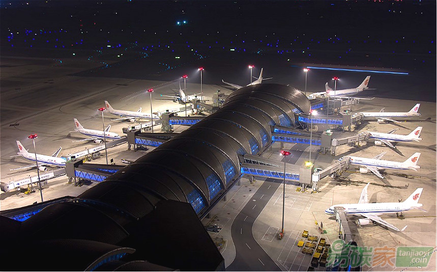 大力推行清潔能源的使用,在航站樓出口通道處,采用碲化鎘弱光發(fā)電