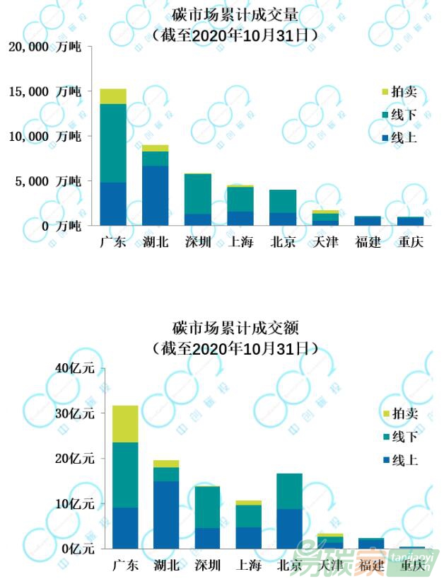 截至2020年10月31日,配額現(xiàn)貨累計(jì)成交4.25億噸,成交額98.64億元。廣東、湖北累計(jì)成交量最高,位于第一梯隊(duì);深圳、上海、北京位于第二梯隊(duì);天津、重慶、福建累計(jì)成交量相對(duì)較低,位于第三梯隊(duì)。