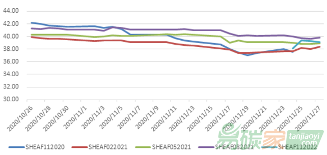 本報(bào)告期內(nèi)(2020年11月23日至2020年11月27日),上海碳配額遠(yuǎn)期(SHEAF)中央對(duì)手清算業(yè)務(wù)保持平穩(wěn)運(yùn)行,11月24日為2020年11月協(xié)議最后交易日,11月25日開市前該協(xié)議完成最終結(jié)算,最終結(jié)算價(jià)為37.57元/噸,開市后2022年11月協(xié)議開始流通。本周SHEAF遠(yuǎn)期市場價(jià)格略有波動(dòng),2021年2月協(xié)議期末結(jié)算價(jià)為38.36元/噸,較上周五環(huán)比上漲0.92元/噸,2021年5月協(xié)議期末結(jié)算價(jià)38.95元/噸,較上周五環(huán)比下跌0.14元/噸(如圖2)。