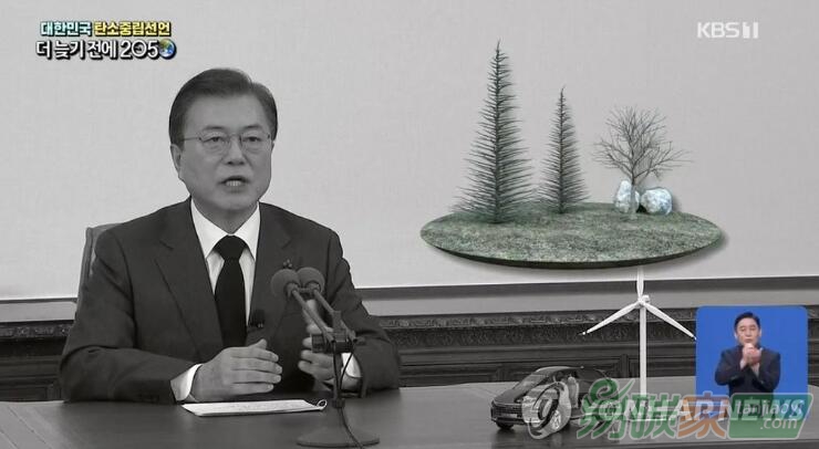 12月10日,在青瓦臺(tái),總統(tǒng)文在寅發(fā)表“2050碳中和宣言”。相關(guān)講話內(nèi)容當(dāng)天以更加環(huán)保低碳的黑白畫(huà)面在全國(guó)直播。 韓聯(lián)社/KBS電視臺(tái)截圖