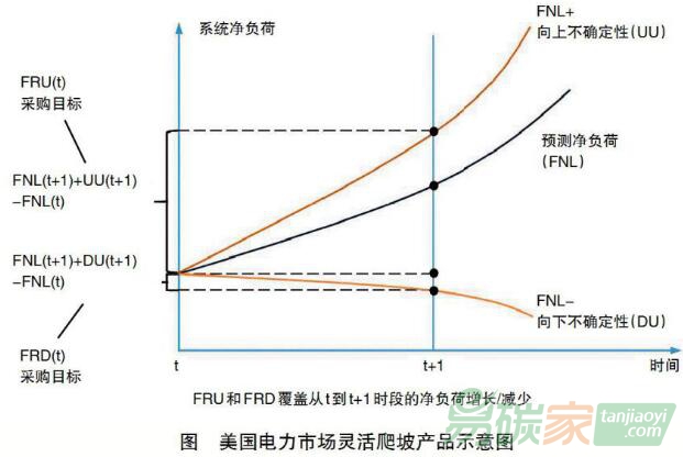 電力市場(CAISO)和中部大陸電力市場(MISO),建立了靈活爬坡產(chǎn)品(Flexible Ramping Product)交易,取得了良好的效果。如圖所示,深藍色曲線表示預(yù)測凈負荷(FNL),即系統(tǒng)總負荷減去可再生能源發(fā)電出力。由于新能源功率預(yù)測的不確定性,取概率為95%的置信區(qū)間,最大預(yù)測凈負荷可增加至(FNL+),其中包括了向上不確定性UU;而最小預(yù)測凈負荷可減小至(FNL-),其中包括了向下不確定性DU。在第t時段采購靈活爬坡產(chǎn)品,要覆蓋從t到t+1時段的凈負荷增長/減少,則需采購的向上靈活爬坡產(chǎn)品為FRU(t)=FNL(t+1)+UU(t+1)-FNL(t),需采購的向下靈活爬坡產(chǎn)品為FRD(t)=FNL(t+1)+DU(t+1)-FNL(t)。靈活爬坡產(chǎn)品與能量(現(xiàn)貨)及備用聯(lián)合出清,與實時備用類似,基于機會成本確定出清價。