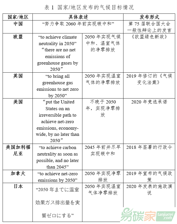 目前已有多個國家/地區(qū)宣布了與碳中和相關(guān)的氣候目標(biāo)和愿景,但表述有所區(qū)別。本文總結(jié)了部分具有代表性的國家/地區(qū)的氣候目標(biāo)基本情況,如下表所示。