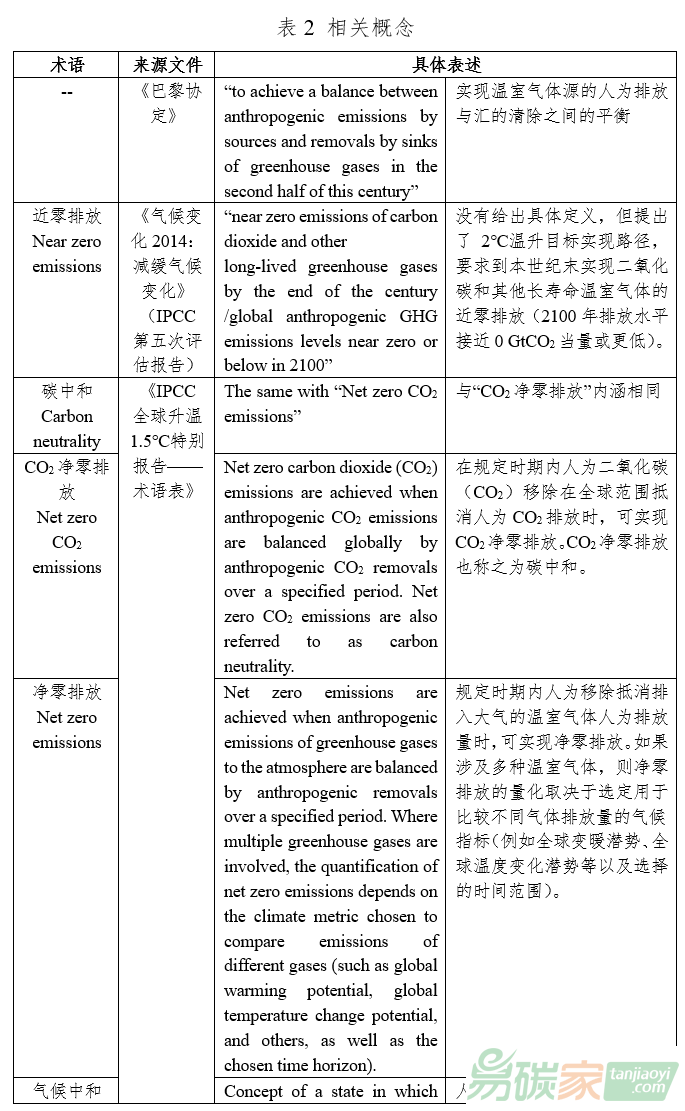 可以看出,各國應(yīng)對氣候變化的目標(biāo)主要表述形式包括“碳中和”、“凈零排放”以及“氣候中和(或譯為氣候中性)”。此外,我們還經(jīng)常會在媒體或文章中看到“近零排放”的表達。為澄清相關(guān)概念在內(nèi)涵上的區(qū)別,本文在表2中梳理了官方文件中上述概念的具體定義。