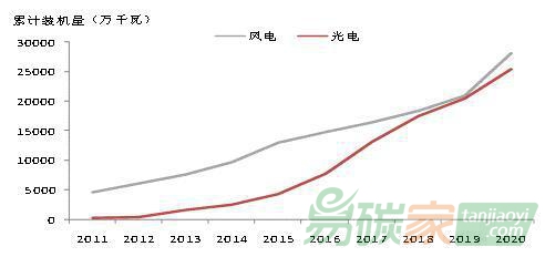 圖|過(guò)去十年我國(guó)光伏、風(fēng)電累計(jì)裝機(jī)量資料來(lái)源:《中國(guó)能源大數(shù)據(jù)報(bào)告(2020)》