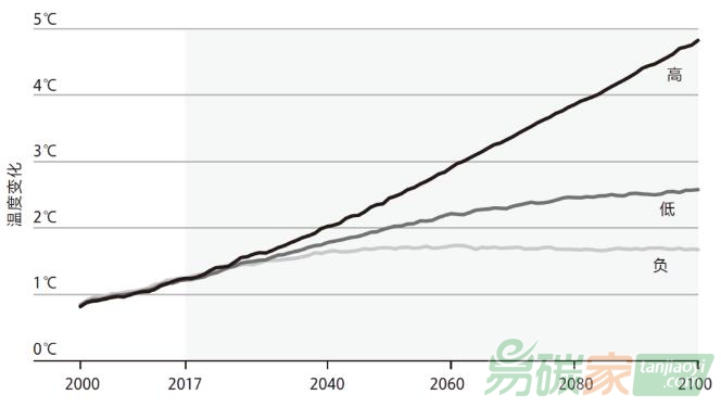 三條線展示了未來(lái)地球溫度在三種情況下的可能變化:如果排放量大幅增加(高)、如果排放量減少(低),以及如果我們消除的碳開始超過(guò)排放的碳(負(fù))