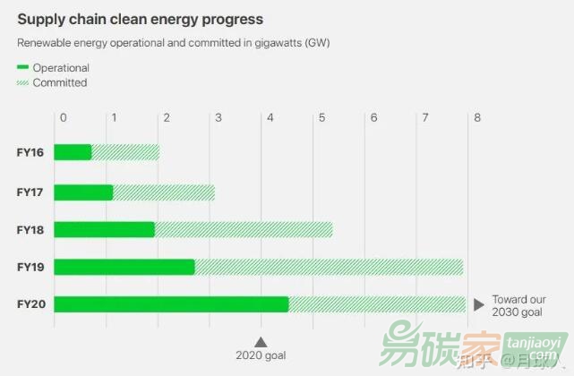 蘋(píng)果除了自己減排,還加強(qiáng)了對(duì)供應(yīng)商的要求,現(xiàn)在供應(yīng)商使用可再生能源裝機(jī)超過(guò)4GW,到2030年將達(dá)到8GW,要知道全中國(guó)2020年可再生能源裝機(jī)還不到10GW,蘋(píng)果供應(yīng)鏈的新能源使用也算“富可敵國(guó)”了。