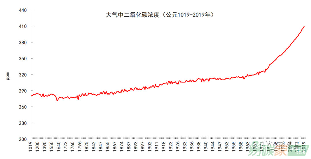 圖2-2 大氣中二氧化碳濃度(公元1019~2019年)