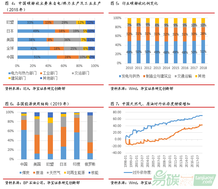 由于資源稟賦及用能結(jié)構(gòu)上的特征,電熱力生產(chǎn)及工業(yè)集中用煤、交通領(lǐng)域大量耗油是導(dǎo)致中國碳排放量較大的主要原因。從資源稟賦上來看,我國呈現(xiàn)出煤炭資源儲量豐富但質(zhì)量較低且分布不均、油氣資源相對不足依賴進(jìn)口、可再生能源儲量豐富技術(shù)水平領(lǐng)先的特點(diǎn),為加快經(jīng)濟(jì)發(fā)展,我國形成了以煤炭為基礎(chǔ),以電力為中心,石油、天然氣、可再生能源等全面發(fā)展的能源生產(chǎn)供應(yīng)體系。從資源使用上,煤炭等燃料燃燒是碳排放量較大的主要原因。根據(jù)BP石油公司的2019年統(tǒng)計(jì)數(shù)據(jù),中國93%的碳排放來自于化石燃料的使用,其中68%來自于固體燃料如煤炭,23%來自于液體燃料如石油等,9%來自于氣體燃料如天然氣等。從行業(yè)分布上,電力及熱力生產(chǎn)及工業(yè)生產(chǎn)產(chǎn)生了較多碳排放。據(jù)IEA統(tǒng)計(jì),2018年中國89%左右的碳排放均來自于電力熱力生產(chǎn)(51%)、工業(yè)生產(chǎn)(28%)及交通運(yùn)輸(10%)部門,其中電力行業(yè)、交通部門碳排放占比隨時(shí)間逐漸增加。