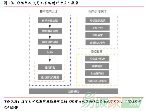根據(jù)清華大學(xué)能源環(huán)境經(jīng)濟(jì)研究所的研究,碳排放權(quán)交易體系的構(gòu)建包括四個(gè)方面、十五個(gè)要素: