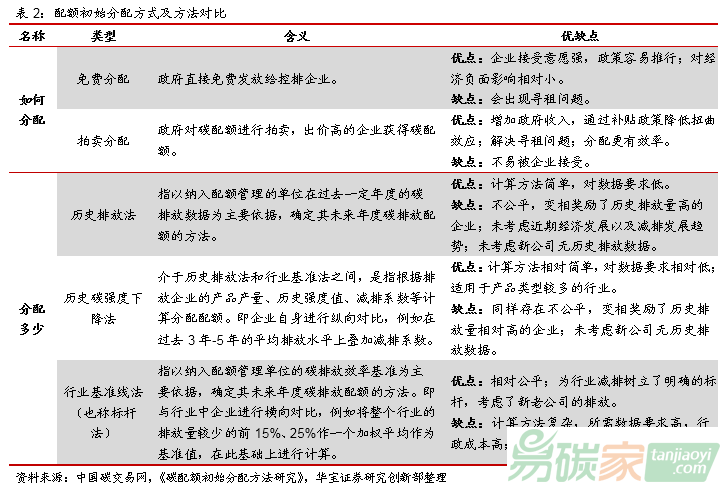 ? 碳排放配額由免費(fèi)分配為主逐步向提高有償分配比例過渡?!短寂欧艡?quán)交易管理辦法(試行)》指出,碳排放配額分配以免費(fèi)分配為主,可以根據(jù)國家有關(guān)要求適時(shí)引入有償分配。參考?xì)W盟碳交易體系,其一級市場中碳配額分配方式從第一階段的免費(fèi)分配過渡到50%以上拍賣,并計(jì)劃2027年實(shí)現(xiàn)全部配額的有償拍賣分配。從國內(nèi)區(qū)域試點(diǎn)來看,我國八大試點(diǎn)中有六個(gè)地區(qū)的碳試點(diǎn)均可以通過拍賣的方式進(jìn)行配額的發(fā)放,但是比例均較低。未來在配額的分配方式上,我國初期仍以免費(fèi)分配為主,參照歐盟等成熟碳交易市場的經(jīng)驗(yàn),未來將逐步提高有償分配的比例,充分利用碳市場的調(diào)節(jié)機(jī)制,推動(dòng)碳配額的有效配置。