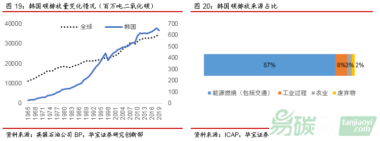 高度依賴化石能源進(jìn)口的韓國是東亞第一個(gè)開啟全國統(tǒng)一碳交易市場的國家,近幾年韓韓國排放權(quán)交易體系發(fā)展勢頭良好。在全球范圍內(nèi)來看,韓國碳排放量排名靠前,2019年韓國碳排放量居世界第七位,且整體排放呈波動(dòng)上漲趨勢。2020年12月30日,韓國已向聯(lián)合國氣候變化框架公約秘書處,提交了政府近期在國務(wù)會議上表決通過的“2030國家自主貢獻(xiàn)”(NDC)目標(biāo),即爭取到2030年將溫室氣體排放量較2017年減少24.4%,以及“2050長期溫室氣體低排放發(fā)展戰(zhàn)略”(LEDS),即至2050年實(shí)現(xiàn)碳中和,將以化石燃料發(fā)電為主的電力供應(yīng)體制轉(zhuǎn)換為以可再生能源和綠色氫能為主的能源系統(tǒng)。相比韓國之前在哥本哈根氣候大會上宣布的減排目標(biāo)(比2005年的排放水平減少4%,比不采取措施的預(yù)計(jì)排放量減少30%),減排目標(biāo)有所加強(qiáng)。從排放來源上看,韓國碳排放主要來源于化石燃料燃燒,占比87%左右,其碳交易體系覆蓋了74%左右的韓國碳排放,同時(shí)覆蓋行業(yè)范圍也較廣,主要包括電力行業(yè)、工業(yè)、國內(nèi)航空業(yè)、建筑業(yè)、廢棄物行業(yè)、國內(nèi)交通業(yè)、公共部門等。但從減排效果上來看,韓國碳減排效果并不明顯,2019年韓國碳排放量相比2005年增加了28%,相比2017年減少了1%。