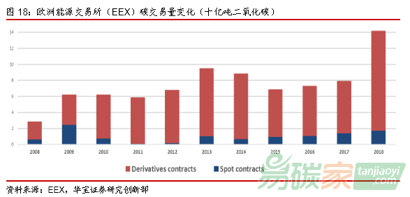 ? 碳金融市場逐步完善。目前我國碳金融市場發(fā)展仍處于初期水平,碳交易仍以現(xiàn)貨交易為主,碳債券、碳期權(quán)、碳質(zhì)押等產(chǎn)品仍處于地區(qū)試點(diǎn)階段,參考?xì)W盟等成熟碳交易體系,其交易產(chǎn)品以期貨、期權(quán)等衍生品為主,未來隨著我國碳市場的建立和發(fā)展,相關(guān)碳金融衍生產(chǎn)品將逐步完善。