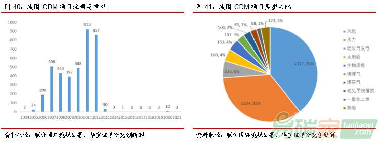 根據(jù)聯(lián)合國環(huán)境規(guī)劃署數(shù)據(jù),截至2021年4月1日,除去撤回項(xiàng)目65個(gè),EB拒絕項(xiàng)目280個(gè),DOEs否定、終止項(xiàng)目分別279、2379個(gè)外,全球注冊備案CDM項(xiàng)目數(shù)共計(jì)8415個(gè),其中,處于驗(yàn)證階段項(xiàng)目558個(gè),申請審查中項(xiàng)目4個(gè),已登記未發(fā)放CERs項(xiàng)目4582個(gè),已登記已發(fā)放CERs項(xiàng)目3271個(gè)。從注冊時(shí)間來看,2004-2012年,全球CDM項(xiàng)目處于高速發(fā)展期,9年注冊備案項(xiàng)目7989個(gè),占比近95%,2013年后,歐盟碳排放交易體系進(jìn)入第三階段,明確可抵消的CERs需來自最不發(fā)達(dá)國家,全球最大碳排放體系對抵消機(jī)制的限制使得注冊CDM項(xiàng)目數(shù)急劇減少。