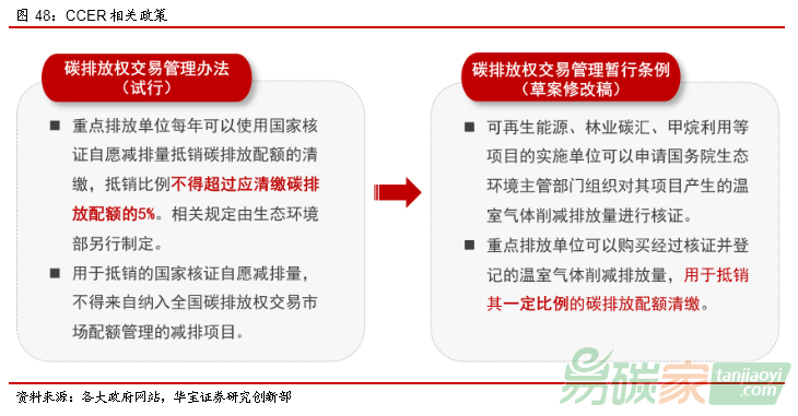 取消了核證減排抵消比例的量化指標(biāo)。2021年3月,生態(tài)環(huán)境部發(fā)布《碳排放權(quán)交易管理暫行條例(草案修改稿)》(征求意見稿)(簡稱“暫行條例”),本次暫行條例明確提出重點(diǎn)排放單位可以購買經(jīng)過核證并登記的溫室氣體削減排放量,用于抵銷其一定比例的碳排放配額清繳。相比而言,2021年1月發(fā)布的《碳排放權(quán)交易管理辦法(試行)》(簡稱“管理辦法”)明確抵消比例為5%。暫行條例沒有明確的量化為增加核證減排量抵消碳排放配額創(chuàng)造了空間,放寬了實(shí)施可再生能源、林業(yè)碳匯、甲烷利用等項(xiàng)目來實(shí)施碳減排。