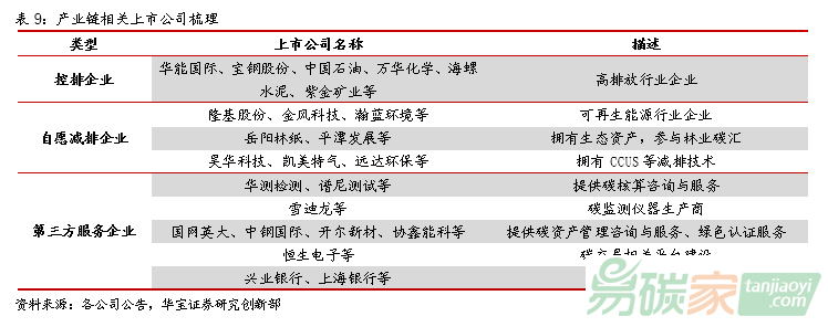 碳交易市場相關(guān)產(chǎn)業(yè)鏈主要分為碳抵消、碳控排與碳服務(wù)三大板塊。1)碳抵消即自愿減排市場,一般流程為自愿減排企業(yè)開發(fā)可再生能源或節(jié)能減排項(xiàng)目,并經(jīng)過政府規(guī)定的項(xiàng)目審定、項(xiàng)目備案、實(shí)施與監(jiān)測、減排量核證、減排量備案一系列流程,最終獲得核證的自愿減排量,可在碳市場進(jìn)行交易。自愿減排企業(yè)包括可再生能源行業(yè)企業(yè)、擁有減排技術(shù)的高新企業(yè)、擁有森林等生態(tài)資產(chǎn)的企業(yè)。2)碳控排即碳配額總量控制與交易市場,主要指控排企業(yè)按時(shí)履約、交易碳資產(chǎn)、減少碳排放的過程,控排企業(yè)為被納入碳交易市場、擁有碳配額的高排放企業(yè),按中國碳市場規(guī)劃主要為電力、鋼鐵、石化、化工、建材、有色金屬、造紙和國內(nèi)民用航空行業(yè)的高排放企業(yè)。3)碳服務(wù)指圍繞碳交易所有第三方服務(wù),包括為政府或企業(yè)提供包括碳核查、碳資產(chǎn)管理(碳盤查、CCER項(xiàng)目開發(fā)、碳報(bào)告、碳配額使用規(guī)劃、減排路徑咨詢、配額交易服務(wù)等)、綠色認(rèn)證、碳金融、平臺或軟件建設(shè)等服務(wù)的相關(guān)企業(yè)。