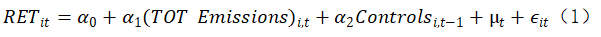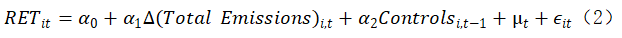 模型(1)衡量了公司的年度總排放量對股票月度收益的影響,模型(2)則估計了公司年度總排放量的百分比變化對其股票月度收益的影響。