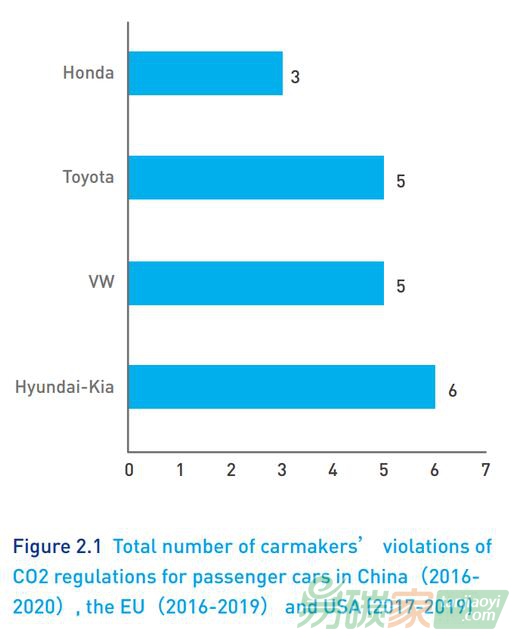 數(shù)據(jù)顯示,在2016年至2020年期間,在中國市場,豐田汽車碳排放表現(xiàn)最差,有5次未達(dá)標(biāo);其次為現(xiàn)代起亞和本田,3次未達(dá)標(biāo);大眾汽車碳排放有2次不達(dá)標(biāo)。而在美國市場,大眾和現(xiàn)代企業(yè)均有3次未達(dá)標(biāo)。神奇的是,豐田這5年間在美國沒有不達(dá)標(biāo)記錄。