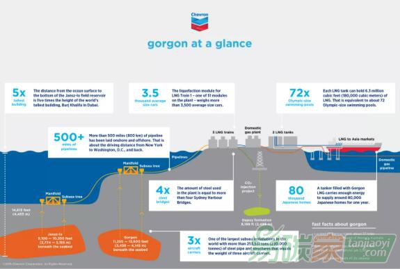 2009年,雪佛龍(Chevron)Gorgon液化天然氣(LNG)項(xiàng)目正式受到西澳大利亞州政府的批準(zhǔn),該項(xiàng)目全球最大的天然氣項(xiàng)目之一,價(jià)值550億美元,設(shè)計(jì)年產(chǎn)能達(dá)到1560萬(wàn)噸LNG。該項(xiàng)目位于澳大利亞西北部的巴羅島自然保護(hù)區(qū),距離西澳大利亞海岸約60公里,由Gorgon和Jansz-Io近海油田提供能源。Gorgon項(xiàng)目由雪佛龍澳大利亞子公司運(yùn)營(yíng),持股47.3%,合伙人包括??松梨冢?5%)和殼牌的澳大利亞子公司(25%),大阪燃?xì)?(1.25%)、東京燃?xì)?(1%) 和 JERA (0.417%)。Gorgon項(xiàng)目的LNG主要面向亞洲