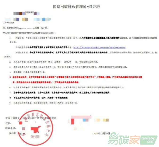 “業(yè)務(wù)員說(shuō)碳排放管理證書(shū)經(jīng)中國(guó)人事網(wǎng)認(rèn)證。付款后出示的合同上寫(xiě)的是‘國(guó)培網(wǎng)’輔導(dǎo)。”他感覺(jué)不對(duì)勁,第二天便聯(lián)系業(yè)務(wù)員要求退款。