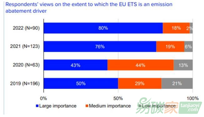 近20年的調(diào)查中,歐盟碳排放交易系統(tǒng)(EU ETS)作為減排工具的重要性正處于歷史最高水平。在今年的市場(chǎng)調(diào)查中,98%的人表示