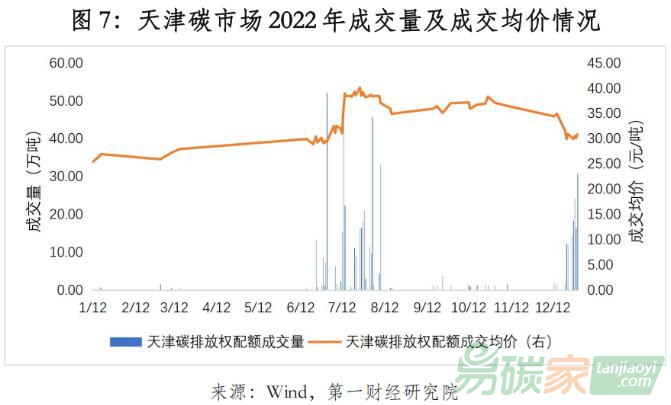 2022年,天津碳市場碳排放配額年度成交量545.24萬噸,年度成交額1.87億元。截至2022年12月31日,天津碳市場碳排放配額(TJEA)累計成交量2411.68萬噸,累計成交額5.97億元,成交均價最高為40.16元/噸,最低為25.50元/噸。