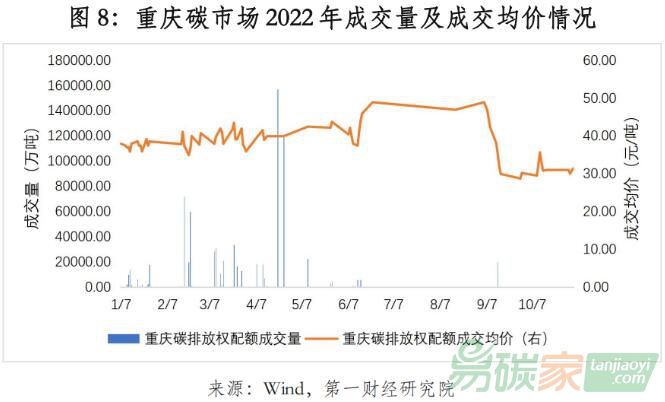 重慶碳市場于2014年6月起開始運行,交易體系覆蓋前三年任一年度溫室氣體排放達到1.3萬噸二氧化碳當量(約5000噸標準煤)及以上的工業(yè)企業(yè),實行免費分配(95%)和有償分配(5%)。免費分配是對不同行業(yè)的重點排放單位采用不同分配方法中的一種或組合的方法進行配額分配,用于市場靈活調節(jié);有償分配主要通過拍賣等方式向市場投放。與其他試點不同的是,重慶試點還覆蓋非二氧化碳的溫室氣體,包括甲烷(CH4)、氧化亞氮(N2O)、氫氟碳化物(HFCs)、全氟碳化物(PFCs)和六氟化硫(SF6),并根據(jù)核算規(guī)則折算為二氧化碳當量進行交易。2022年重慶碳價出現(xiàn)一定幅度的下降,年末維持在30元/噸左右。從成交情況來看,重慶碳市場的活躍度較低,許多月份未發(fā)生交易,與重慶市納入管理的重點排放單位數(shù)量較少存在一定關系。