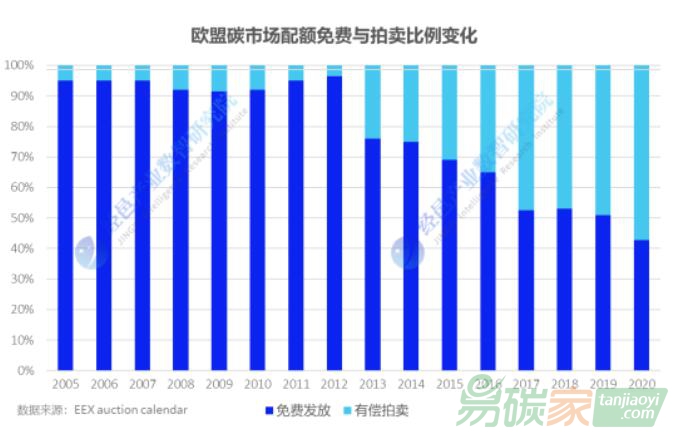 市場的免費(fèi)配額比例是不斷縮減的:第一階段(2005-2007)免費(fèi)配額95%,期末碳價(jià)跌至接近0歐元/噸;第二階段(2008-2012)免費(fèi)配額90%,有償拍賣額度10%,同期碳價(jià)僅10歐元/噸;第三階段(2013-2020)免費(fèi)額度以年均1.74%的幅度縮減,碳價(jià)從5歐元/噸上漲至32歐元/噸;第四階段(2021-2030)有償拍賣額度已大于50%,免費(fèi)額度以年均2.2%的幅度繼續(xù)縮減,截至2021年碳價(jià)已飆升至55歐元/噸??梢?,免費(fèi)配額供給量的適時(shí)縮減與有償