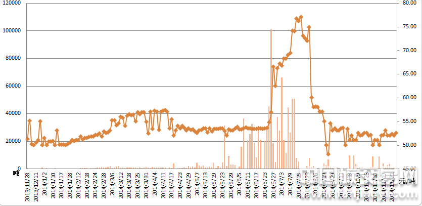 從全年走勢來看,2013年市場起步階段的成交比較分散,偶然性很大。除開市當(dāng)天外,僅達(dá)成7筆交易,均量不足300噸/天。進(jìn)入2014年,交易明顯活躍,尤其是處于履約關(guān)鍵期的5月、6月和7月。三個月的合計交易量達(dá)到190萬噸,約占全年90%。期間,價格也從50元/噸波動上漲至70元/噸附近,最高時達(dá)到80元/噸。隨著履約工作的結(jié)束,價格又逐步回落至50-55元之間。