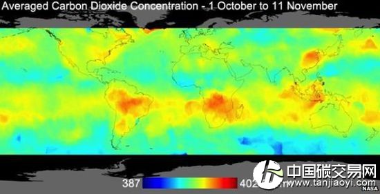 由“嗅碳”衛(wèi)星OCO-2發(fā)回的首張全球二氧化碳平均濃度地圖顯示,澳大利亞以北地區(qū)、非洲南部和巴西上空二氧化碳濃度最高。(美國《科學美國人》月刊網站)