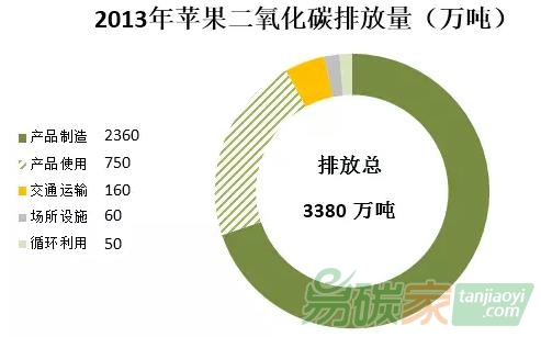 碳足跡分析,并向社會公布,接受公眾監(jiān)督。在發(fā)布的《2014年環(huán)境責(zé)任報告》里,我們可以了解蘋果公司2013年全年二氧化碳排放的情況,排放總量為3380萬噸,其中排放量最高的是產(chǎn)品制造環(huán)節(jié),排放量高達2360萬噸,占總量的70%,其次是產(chǎn)品使用排放750萬噸、