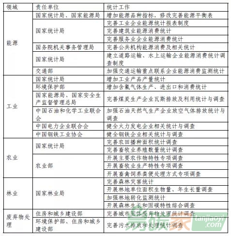交通運輸行業(yè)的能源統(tǒng)計;健全工業(yè)產(chǎn)品產(chǎn)量及含氟氣體生產(chǎn)、進出中和消費統(tǒng)計,健全高排放行業(yè)相關的統(tǒng)計與調(diào)查;完善農(nóng)業(yè)、土地利用變化及林業(yè)、廢棄物處理相關統(tǒng)計與調(diào)查。由于完善溫室氣體排放基礎統(tǒng)計工作涉及多部門與協(xié)會,意見制定了詳細的責任分工。