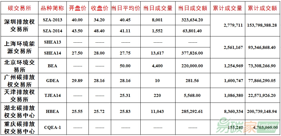 品種SZA-2013成交8,001噸,成交額323,634.20元,開盤價(jià)40.00元,最高價(jià)41.80元,最低價(jià)34.20元,收盤價(jià)34.20元,較前一交易日下跌10.00%。品種SZA-2014成交1,552噸,成交額63,801.40元,開盤價(jià)43.50元,最高價(jià)48.40元,最低價(jià)40.00元,收盤價(jià)48.40元,較前一交易日上漲10.00%。截止當(dāng)日,深圳碳